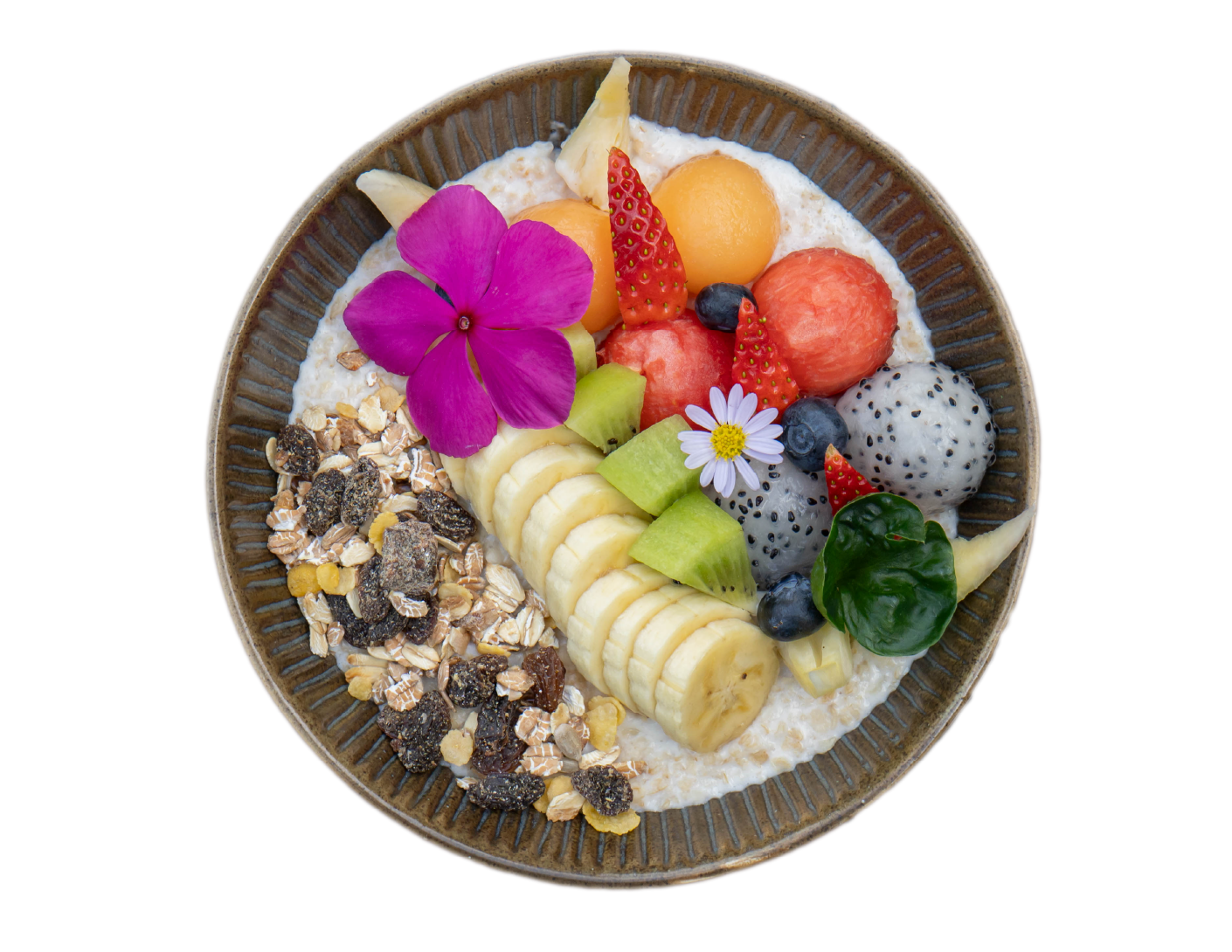 With coconut cream, mixed fruits, granola and roasted coconut flake