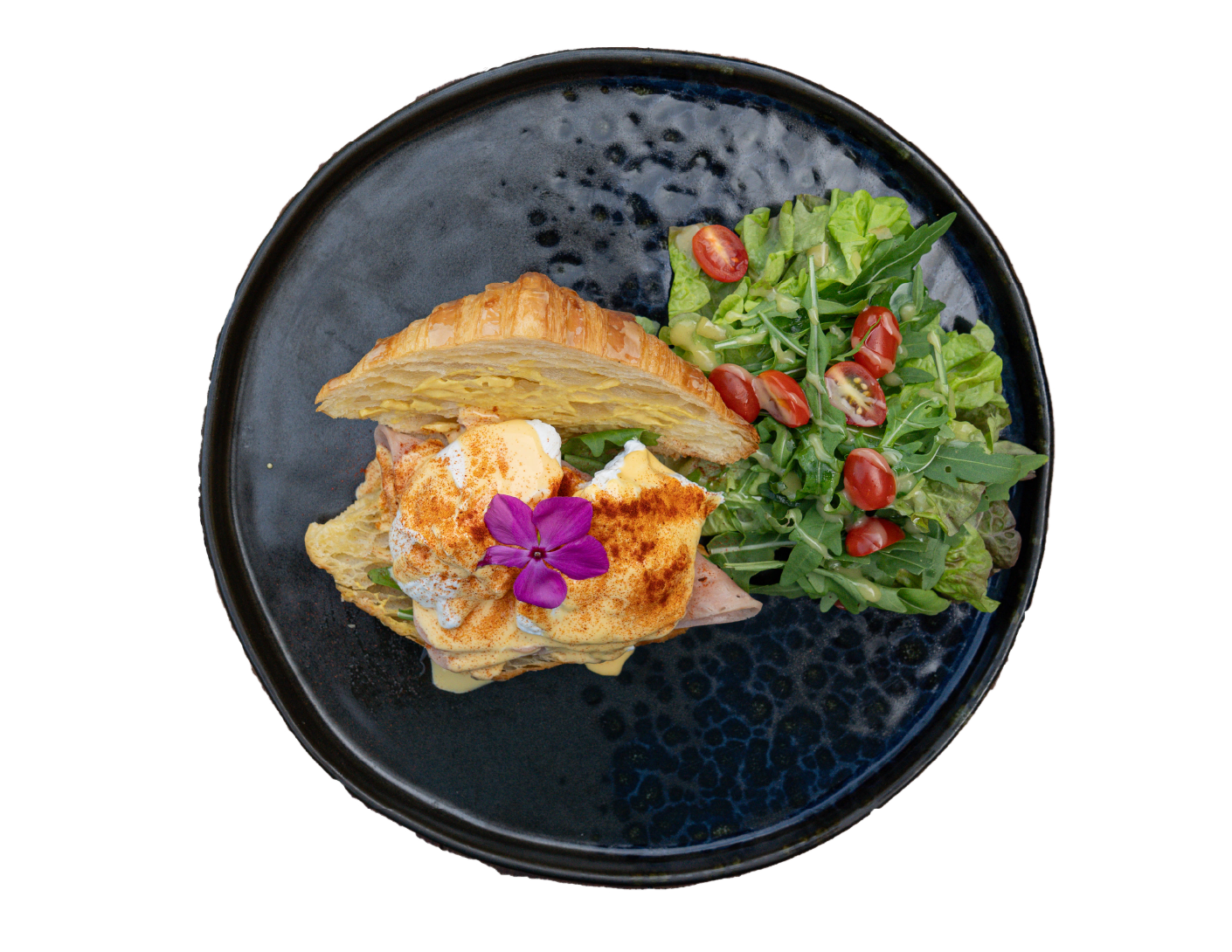 Croissant, black ham, rocket salad, poached eggs, and béarnaise sauce