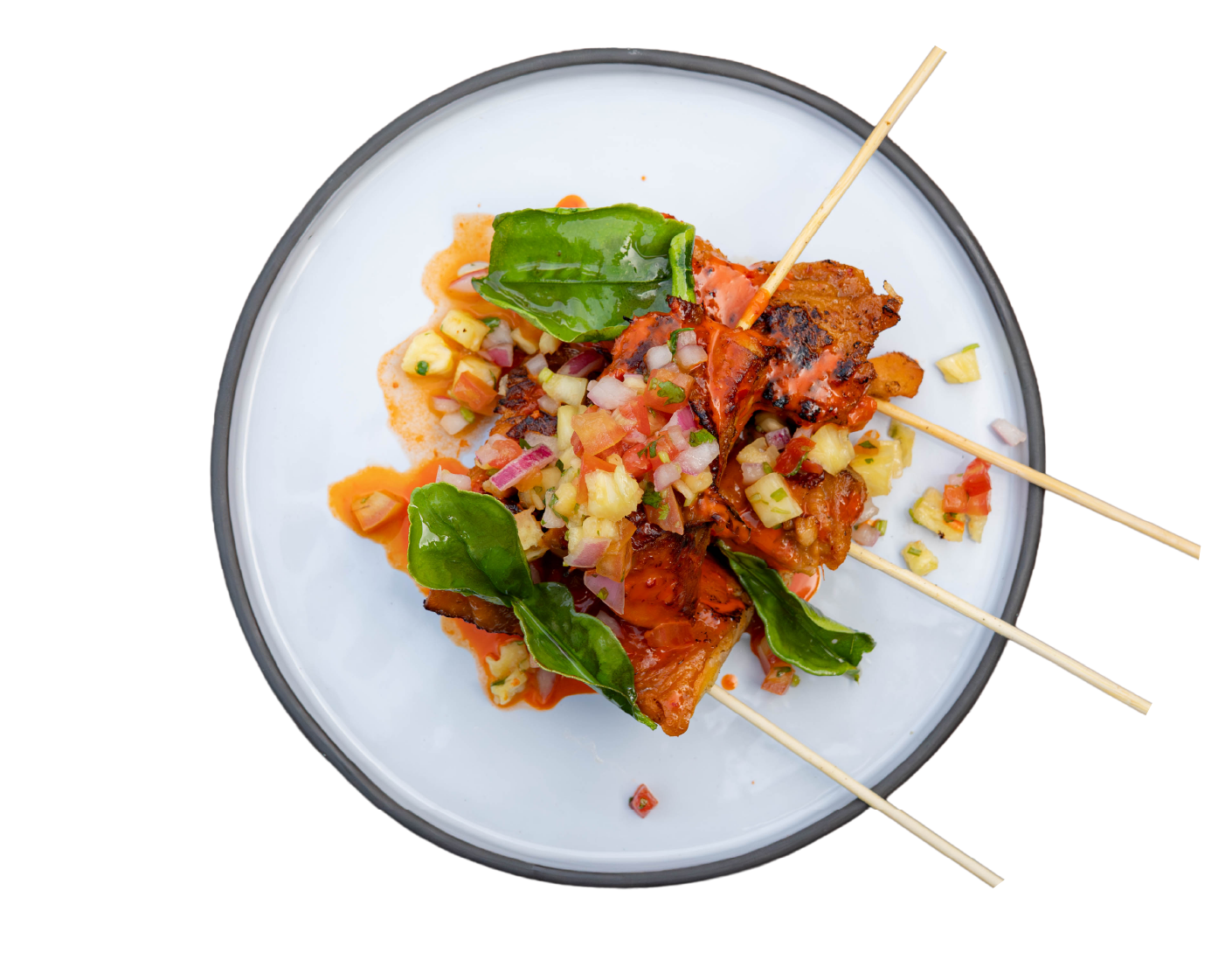 Red curry marinated chicken skewer, coconut and pineapple salsa